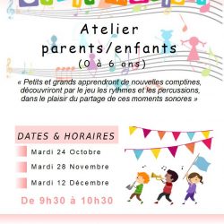 Atelier Parents / enfants (de 0 à 6 ans) « Éveil musical » mardi 24 octobre de 9h30 à 10h30. Petits & grands apprendront de nouvelles comptines, découvriront par le jeu les rythmes & les percussions, dans le plaisir du partage de ces moments sonores… Pensez à vous inscrire ! s »